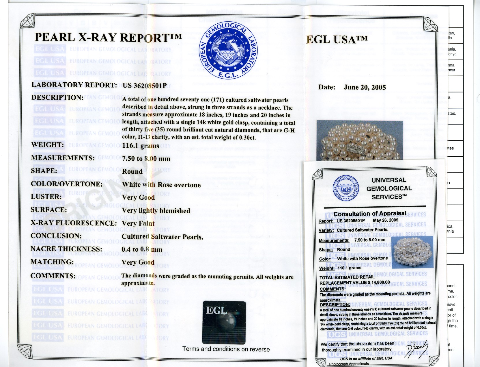 This item features genuine Akoya cultured pearls. Pictures and description show the actual item. The necklace comes with EGL Pearl X-Ray Report and Appraisal Report (US36208501P). Total estimated retail replacement value is $14,800.00. Pearl Information:Pearl Type: Akoya saltwater cultured pearls. Size: 7.5 to 8MM Shape: Round. Body Color: White. Overtone: Pink. (Rose). Luster: Very High. Surface: Very Slightly Blemished. Nacre Thickness: Very Thick. 0.4MM to 0.8MM. Matching: Very Good Match. Origin: Japan. Length: Triple strands in 18", 19" and 20". Clasp: 14K White Gold. Triple strand antique style clasp with safety lock. Gem Information: Diamond. 35 Round brilliant cut natural diamonds, they are G-H color, I1-I3 clarity. Total weight is 0.30 carat.