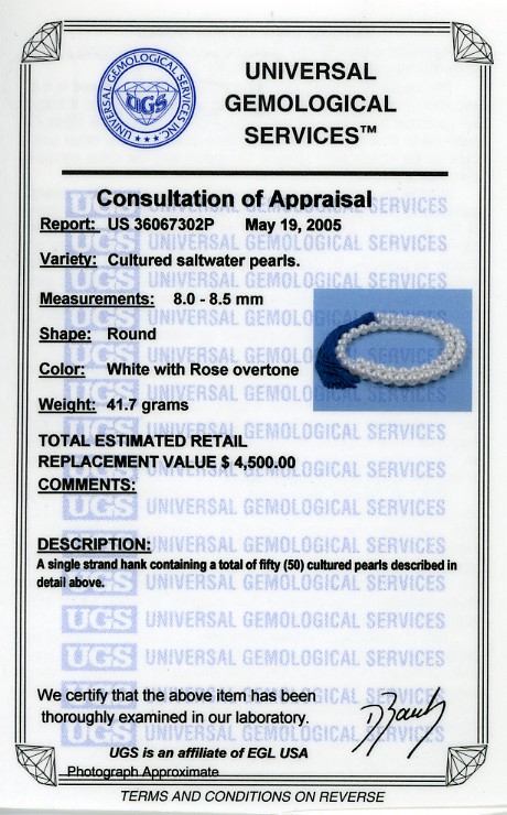 This item features genuine cultured pearls grade AAAA. This necklace comes with EGL Pearl X-Ray Report and EGL/UGS Consultation of Appraisal. Retail Replacement Value is $4500 (for pearls only). EGL Certificate number is US36067302P. Pearl Information:Pearl Type: Akoya saltwater cultured pearls. Size: 8 to 8.5MM. Shape: Round. Body Color: White. Overtone: Rose (Pink). Luster: Very High. Surface: Very Slightly Blemished. Nacre Thickness: Thick. Matching: Very Good Match. Origin: Japan. Length: 18-inch (Princess). Strand is 16" (50 pearls) before knots and clasp. Finished necklace with knots between each pearl and attached clasp is 18". Setting: 18K Yellow Gold. Antique Style Double Sided Safety Clasp. (18K White Gold Clasp in the same style available upon request). Gem Information: Diamond. 6 Round diamonds totally weight 0.04 carat.